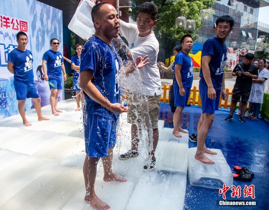 8月11日,在企鵝館舉行的決賽中,工作人員給參賽選手桶里加冰塊。當(dāng)日,一場充滿趣味性的“冰極挑戰(zhàn)賽”在武漢海昌極地海洋世界上演,參賽者們經(jīng)過“極地初體驗”和“極寒企鵝館耐寒挑戰(zhàn)”兩個環(huán)節(jié),堅持時間長者獲勝。中新社記者張暢 攝