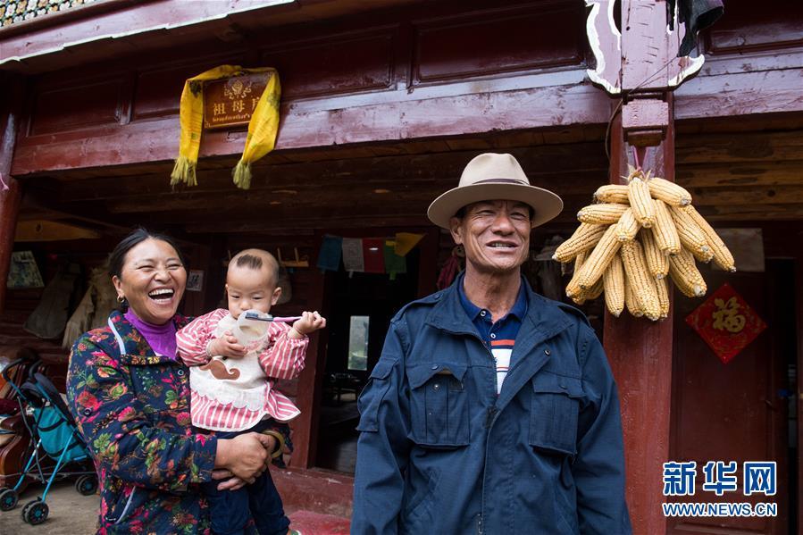 寧蒗永寧鄉(xiāng)泥鰍溝村委會八珠村民小組的摩梭人阿普私根(右)站在自家門口(7月30日攝)。他家是摩梭母系家庭重點保護民居,依靠旅游服務(wù)等家庭年收入近20萬元。新華社記者 胡超 攝