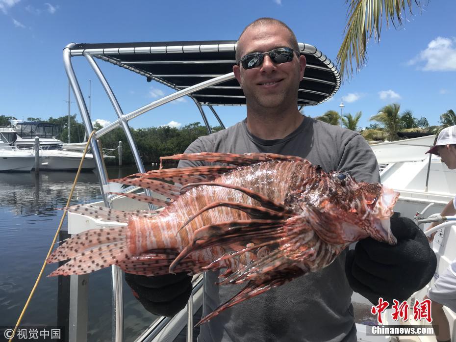 8月21日訊(具體拍攝時(shí)間不詳),近日,來(lái)自長(zhǎng)島的Timothy Blasko打破了記錄,他捕獲了大西洋最重的獅子魚(yú)。37歲的Timothy Blasko是一名技術(shù)精湛的捕魚(yú)者,當(dāng)天,他和朋友們?cè)诜鹆_里達(dá)群島伊斯拉莫拉達(dá)海岸捕魚(yú)時(shí),遇到了這條大魚(yú)。Timothy向朋友要來(lái)了魚(yú)叉,瞄準(zhǔn)大魚(yú)的下方位置叉去,正中目標(biāo)成功捕獲。當(dāng)他們把這條魚(yú)和當(dāng)天捕獲的其它魚(yú)排在一起時(shí),他們猜測(cè)這條魚(yú)可能會(huì)破紀(jì)錄?!八?jiǎn)直是獅子魚(yú)中的哥斯拉!” Timothy描述道,“這條巨大的獅子魚(yú)重達(dá)3.1磅,刷新了大西洋迄今最重獅子魚(yú)的國(guó)家紀(jì)錄。”圖片來(lái)源:視覺(jué)中國(guó)