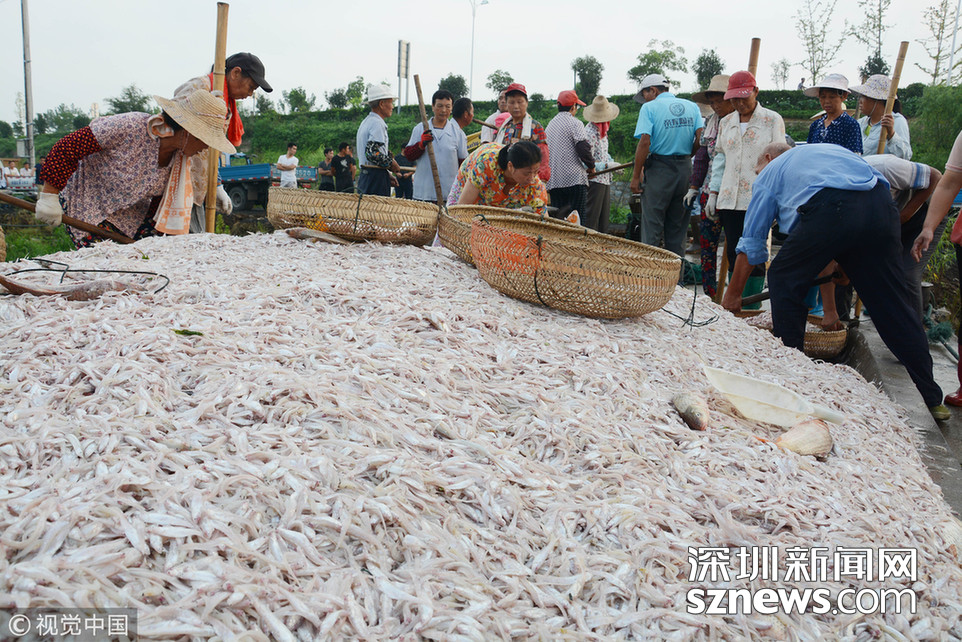 ???? 2018年6月26日,江蘇省常州市嘉澤鎮(zhèn)捕撈村的漁民組織夏季捕撈,一網(wǎng)魚達五萬余斤,以鰱魚為主,供應(yīng)市場需求。夏捕的魚價較平時有所上漲,漁民粗略估計可增收上萬余元。