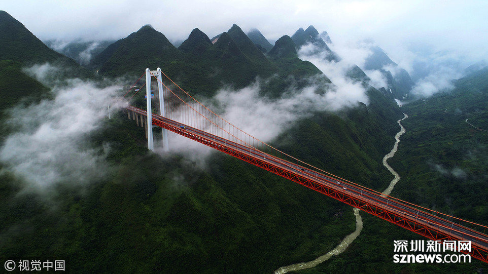 2018年6月26日,一場大雨后貴州省安順市關(guān)嶺縣壩陵河大峽谷云霧繚繞,橫跨兩岸的壩陵河大橋在云霧中時隱時現(xiàn),更顯雄偉壯觀。
