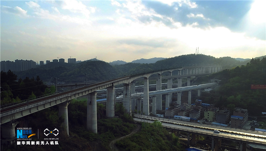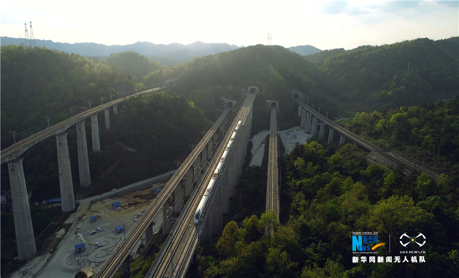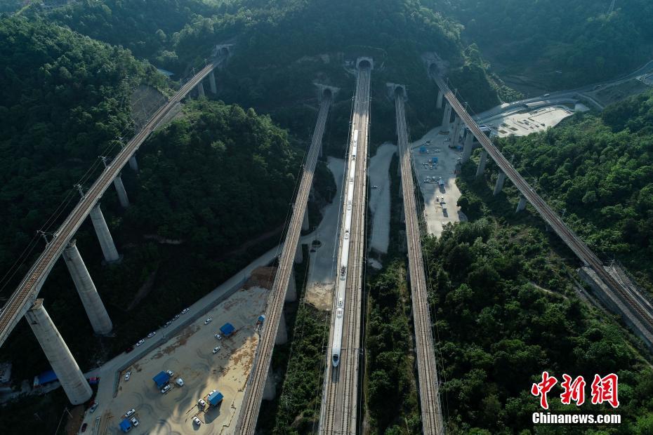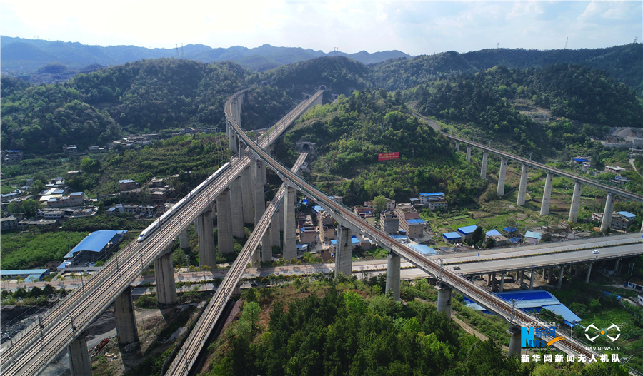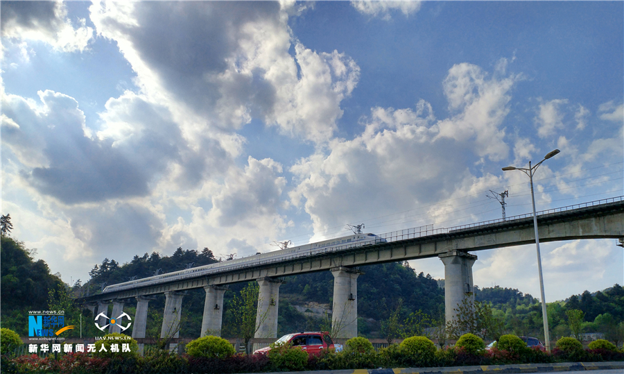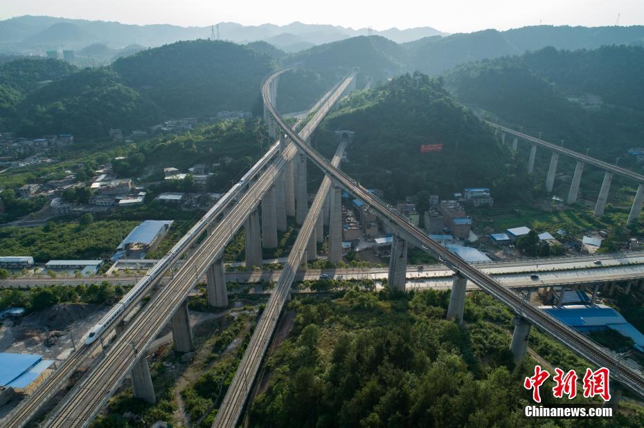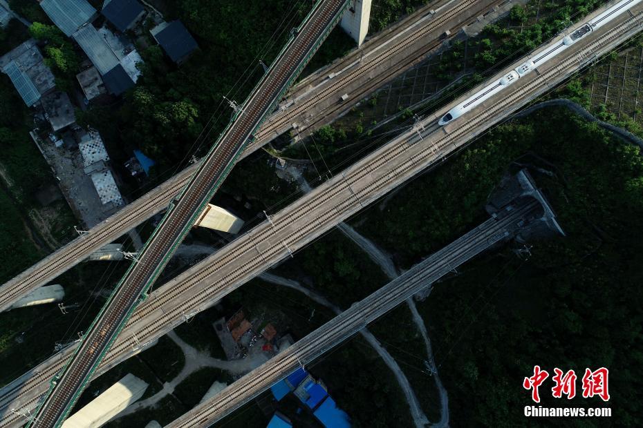 5月16日,航拍貴陽市郊交織的五條高鐵線路,一列動(dòng)車駛出隧道。貴州省地處中國(guó)西南腹地,高原山地居多,因此高鐵建設(shè)的橋隧占比較高。在貴陽市烏當(dāng)區(qū)新添寨,高鐵滬昆線、貴廣客運(yùn)專線、貴開城際客運(yùn)專線的隧道和橋梁交織在一起,形成“五洞五橋”并行。中新社記者賀俊怡 攝 5月16日,一列動(dòng)車從貴陽市郊交織的橋梁上駛過。貴州省地處中國(guó)西南腹地,高原山地居多,因此高鐵建設(shè)的橋隧占比較高。在貴陽市烏當(dāng)區(qū)新添寨,高鐵滬昆線、貴廣客運(yùn)專線、貴開城際客運(yùn)專線的隧道和橋梁交織在一起,形成“五洞五橋”并行。中新社記者賀俊怡 攝