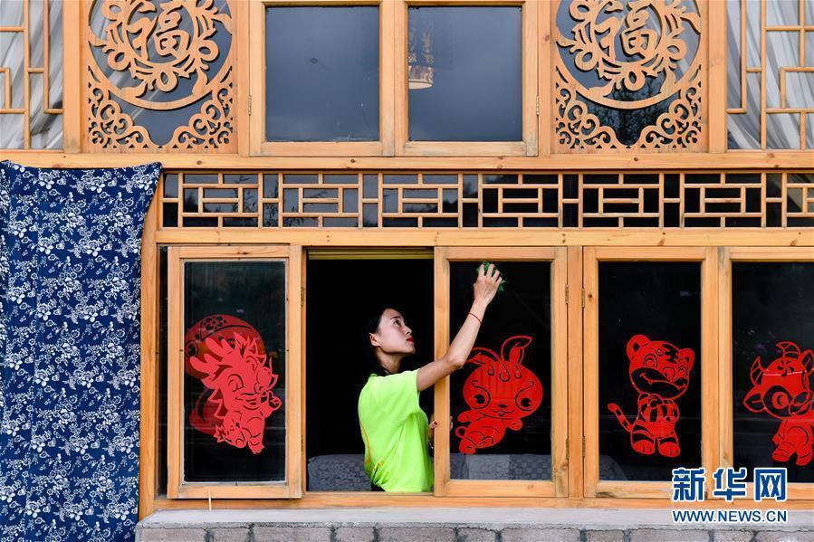 在寧夏固原市西吉縣吉強鎮(zhèn)龍王壩村,一名服務員在“窯洞賓館”擦玻璃(8月30日攝)。