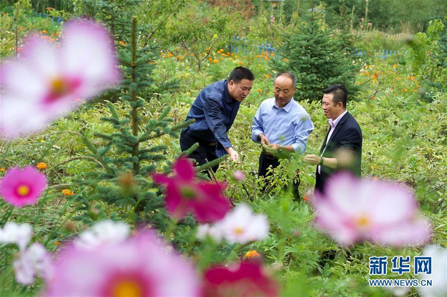 在寧夏固原市西吉縣吉強鎮(zhèn)龍王壩村,固原市農(nóng)業(yè)學校林業(yè)高級講師鄧志力(中)在指導村民進行油用牡丹種植(8月30日攝)。