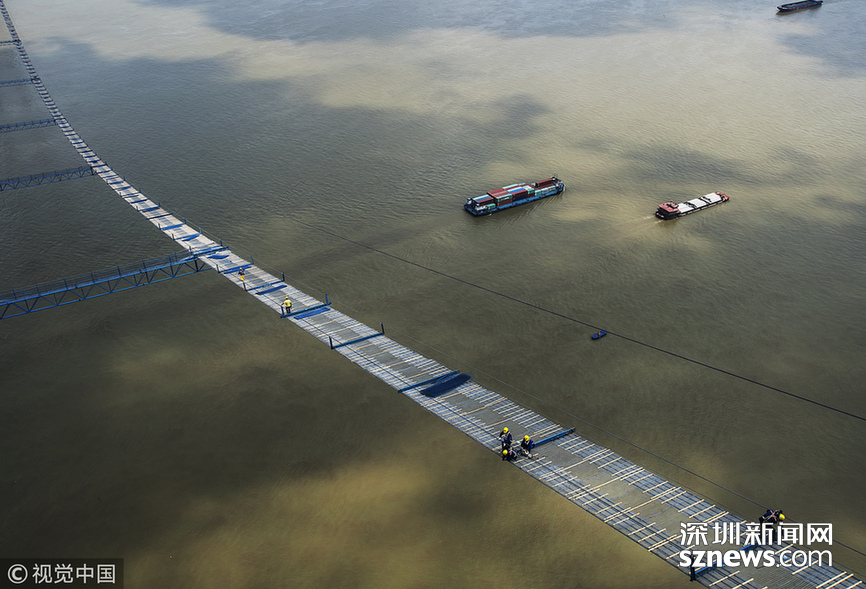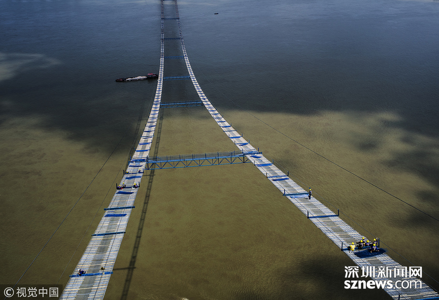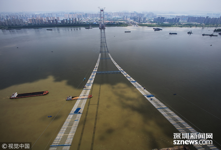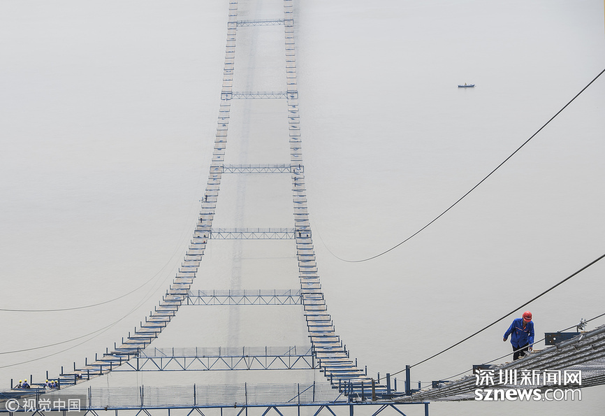 2018年5月14日,武漢,武漢楊泗港長江大橋上空,上部結構施工進入貓道面網(wǎng)鋪設階段,數(shù)十名中鐵大橋局工人在跨江高空拼搏趕超,江面上空的臨時“吊橋”悄然形成。數(shù)十名工人在長江上空228米處拼搏趕超,臨時“天梯”悄然形成。