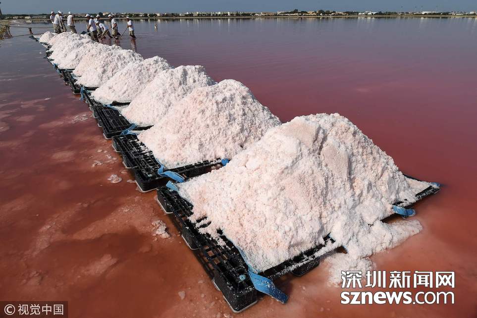 深圳新聞網(wǎng)訊? 法國(guó)艾格莫特,工人們?cè)邴}灘收集鹽晶體,那里的鹽場(chǎng)面積達(dá)1萬(wàn)公頃。在收獲了手工海鹽“鹽之花”之后,他們必須等到九月份才能收獲用作食鹽的鹽?!胞}之花”是世界上最昂貴的鹽之一(100g價(jià)格可達(dá)數(shù)千元)。