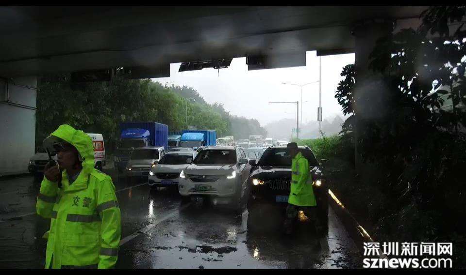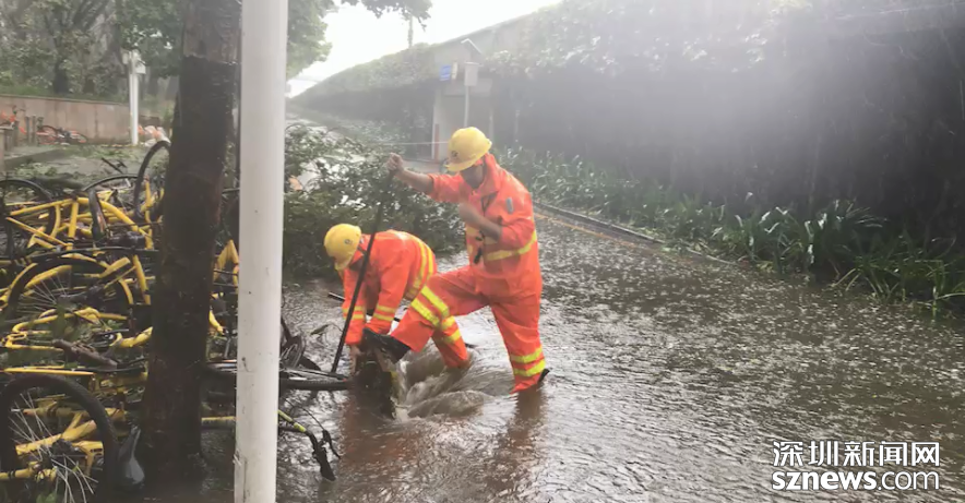 福田區(qū)位于北環(huán)皇崗立交,深圳市水務(wù)集團(tuán)福田分公司梅林所防洪排澇人員,趁風(fēng)勢(shì)雨小,打開(kāi)雨水箅子排積水。