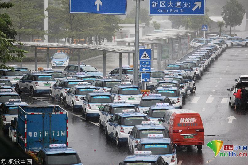 2018年9月16日,受臺(tái)風(fēng)山竹影響,全市的電動(dòng)車(chē)充電站暫停使用。深圳市民樂(lè)P+R停車(chē)場(chǎng)外,停滿了等待充電站開(kāi)門(mén)的電動(dòng)出租車(chē)。