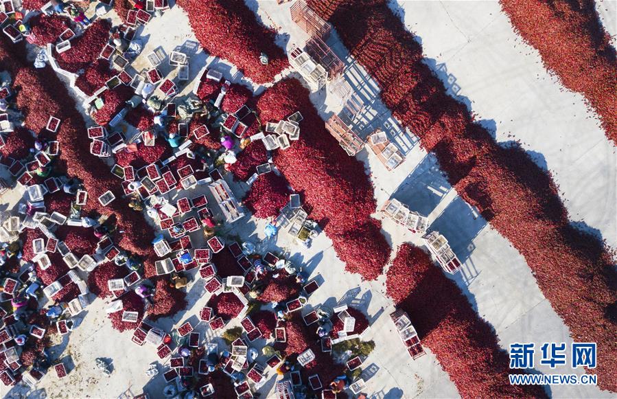 秋收時(shí)節(jié),吉林省白城市通榆縣的辣椒迎來(lái)豐收?;鸺t的辣椒和勞作的農(nóng)民構(gòu)成一幅幅美麗的豐收?qǐng)D景。