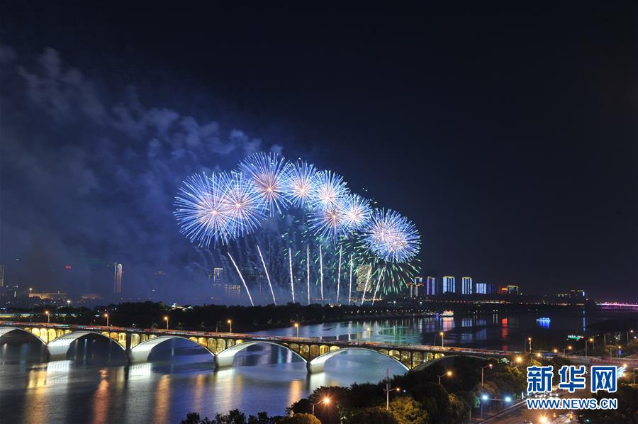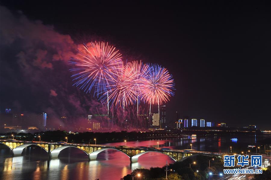 9月19日晚,湖南省長(zhǎng)沙市在湘江橘子洲舉辦焰火晚會(huì),絢麗的焰火與湘江兩岸的城市夜景交相輝映。
