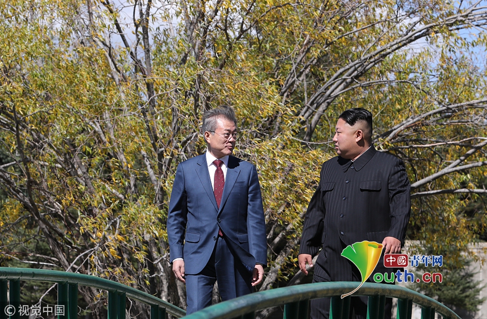 當(dāng)?shù)貢r間2018年9月20日,朝鮮,韓國總統(tǒng)文在寅和朝鮮領(lǐng)導(dǎo)人金正恩在三池淵招待所共進(jìn)午餐后散步。圖片作者:Yonhap News Agency/視覺中國