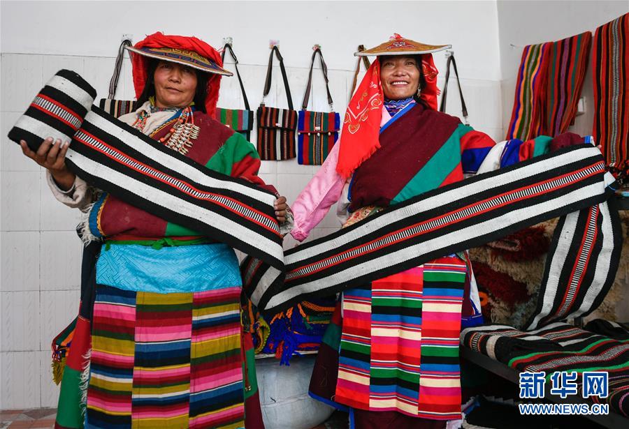 員工益西措姆(左)與嘎措在鹽湖鄉(xiāng)羌麥村民族手工編織廠展示產(chǎn)品(9月19日攝)。 2018年,西藏阿里地區(qū)革吉縣鹽湖鄉(xiāng)政府自籌資金成立羌麥村民族手工編織廠,編織廠將當(dāng)?shù)貍鹘y(tǒng)手工編織技藝與市場(chǎng)需求相結(jié)合,生產(chǎn)手提包、圍脖、腰帶、毛毯、藏式頭巾等產(chǎn)品,并參加旅游推介活動(dòng),拓寬編織品銷售渠道,助力當(dāng)?shù)鼐用衩撠殹?新華社記者 劉東君 攝