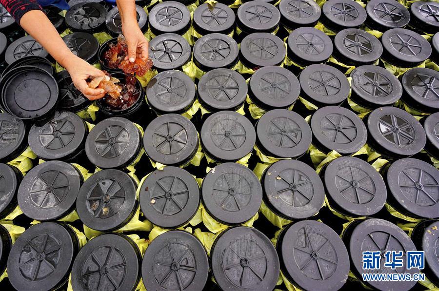9月21日,灤南縣南堡鎮(zhèn)南堡二村一家海蜇養(yǎng)殖場的工人在展示鹵制好的海蜇頭。新華社記者楊世堯攝