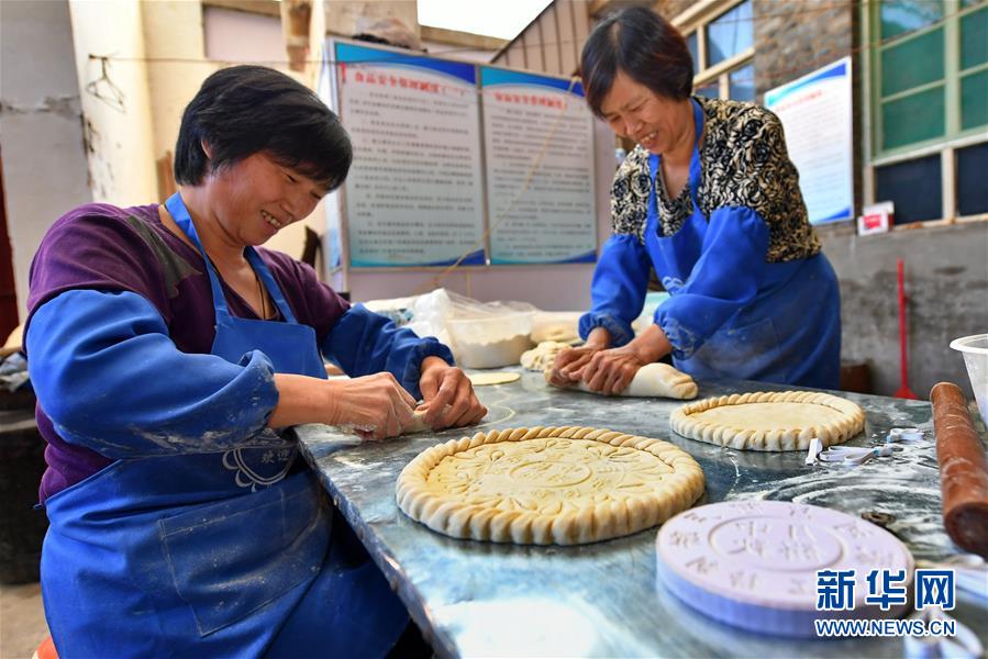 9月22日,段河村村民段粉拽(左)和段金花在制作月餅。 中秋節(jié)來臨之際,山西省晉城市澤州縣南嶺鄉(xiāng)段河村的段富善一家人忙碌起來,他們家制作的“柴火月餅”遠近聞名。 “柴火月餅”起源于明清時期,餡料以糖搭配花生仁、芝麻、玫瑰等,有近10道制作工序,其中最有特色的是木柴烤制工藝,烘烤師傅必須掌握好火候,才能烤出外皮酥脆、餡料飄香的月餅。 新華社記者 曹陽 攝