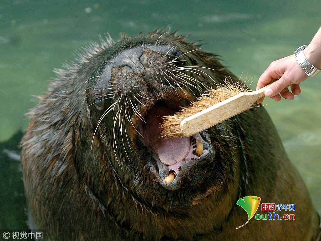 2006年5月18日,英國城市達德利,一只十四歲的海獅奧利爾在動物園里接受飼養(yǎng)員的護理。奧利爾體重達四百千克,每次進餐后飼養(yǎng)員要給奧利爾刷牙,每月進行一次牙科衛(wèi)生檢查。