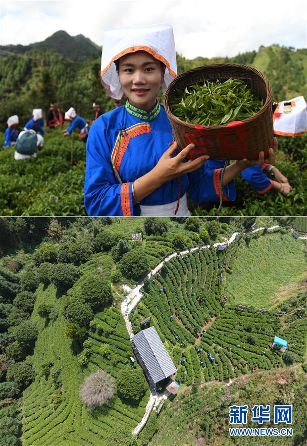 這張拼版照片顯示的是:上圖,9月20日,廣西金秀瑤族自治縣金秀鎮(zhèn)六段村村民蘇思林展示剛采摘的秋茶;下圖,9月20日,茶農(nóng)在金秀鎮(zhèn)六段村茶園內(nèi)采茶(無(wú)人機(jī)拍攝)。 新華社記者陸波岸攝
