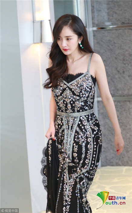 楊冪卷發(fā)成熟美露香肩 自提裙擺過(guò)酒店大堂