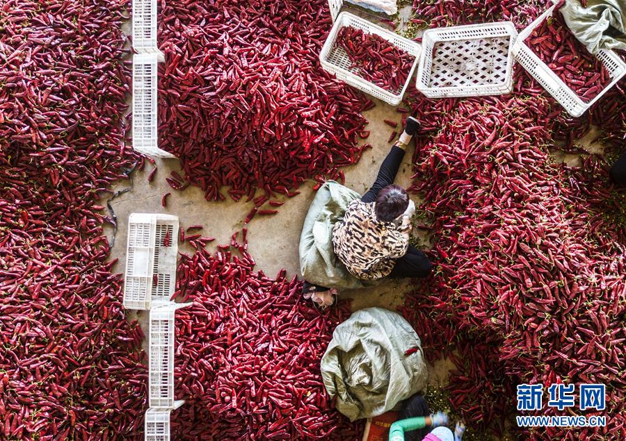 9月19日,在吉林省白城市通榆縣,農民在分揀收獲的辣椒。 新華社記者 張楠 攝