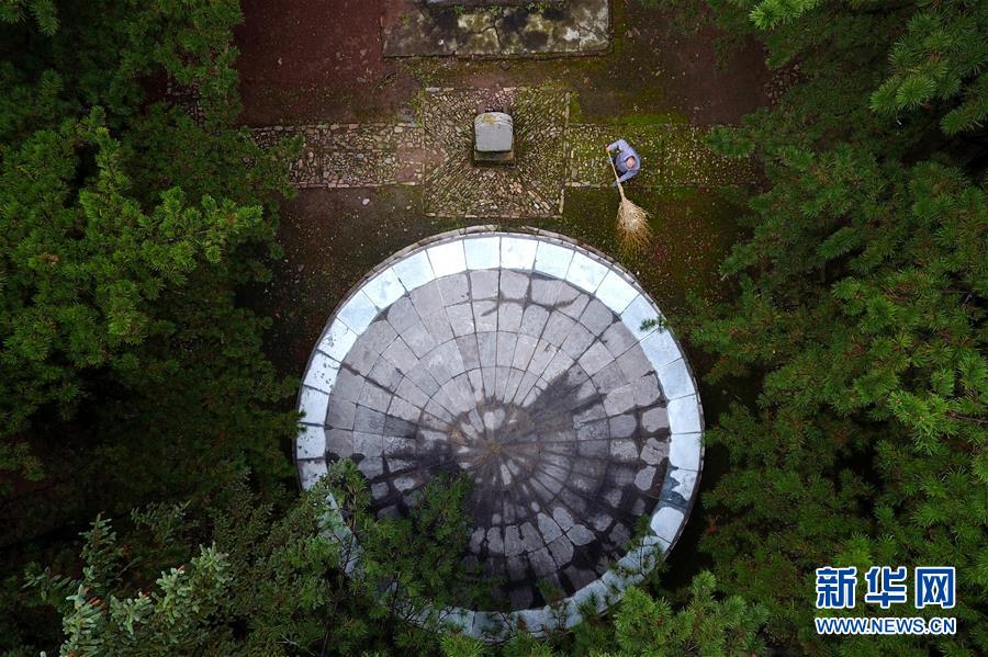 在黃崖洞烈士陵園,趙乃堂在清掃落葉(9月20日無人機(jī)拍攝)。 新華社記者 詹彥 攝