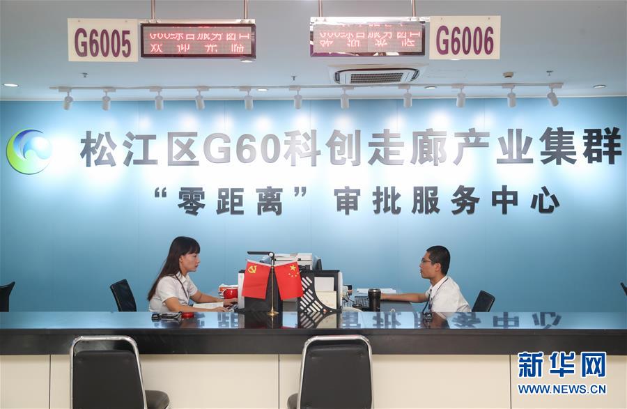 這是上海市松江區(qū)行政服務(wù)中心內(nèi)的G60科創(chuàng)走廊產(chǎn)業(yè)集群“零距離”審批服務(wù)中心(9月28日攝)。