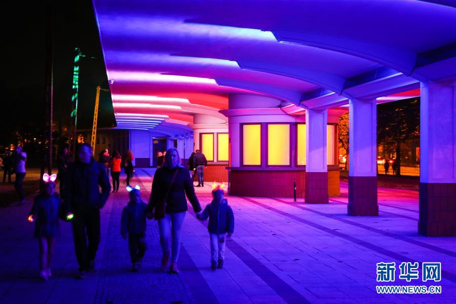 9月28日,游客在波蘭羅茲市中心舉辦的2018“舞動”燈光節(jié)上游玩。2018“舞動”燈光節(jié)于9月28日至30日在波蘭中部交通樞紐城市——羅茲市舉行,各式各樣的光影表演在這座城市的各個角落同時上演,組成了一場如夢如幻的大型燈光秀。新華社記者陳序攝
