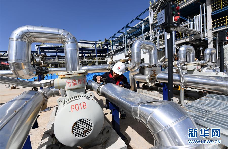 延安煤油氣資源綜合利用項(xiàng)目甲醇制烯烴中心的工作人員在進(jìn)行設(shè)備巡檢(9月28日攝)。新華社記者劉瀟攝