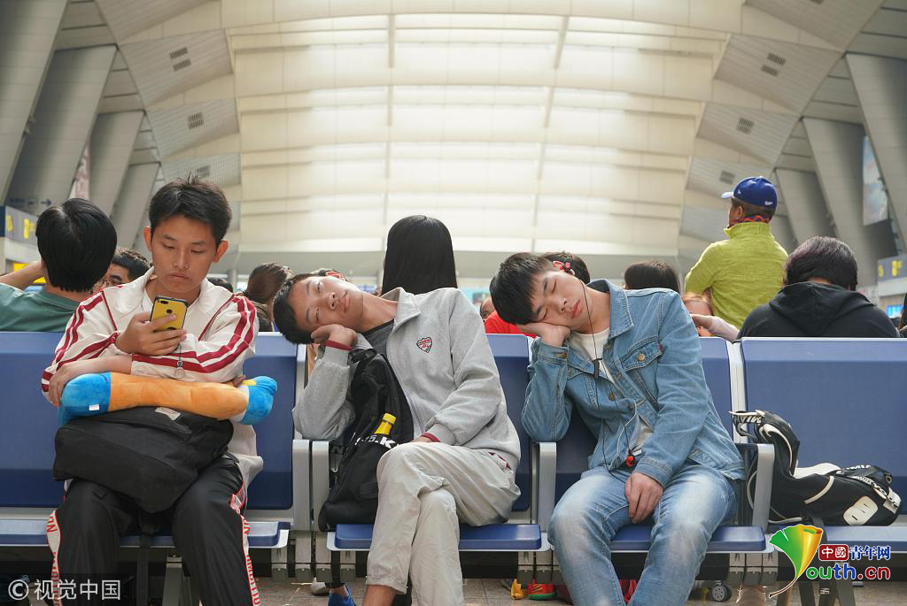 2018年10月1日,兩名旅客在北京南站內(nèi)候車時打盹。當(dāng)天是國慶假期首日,北京南站迎來客流高峰。此前,據(jù)北京鐵路局預(yù)計,國慶黃金周將發(fā)送旅客1168萬人,同比增加19.9萬人。其中10月1日為出行高峰日,預(yù)計當(dāng)天發(fā)送旅客143萬人,同比增加4.7萬人。圖片作者:張興龍