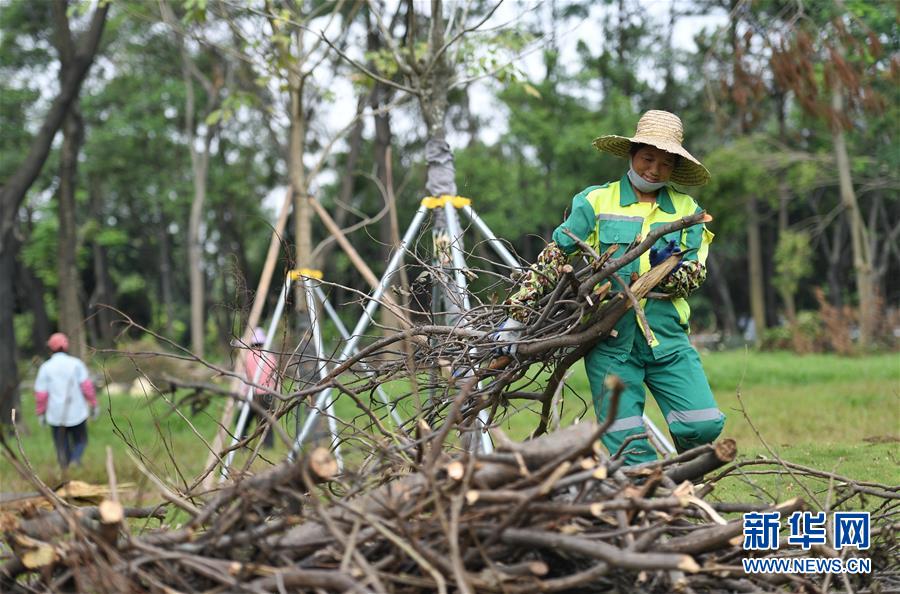 10月1日,工作人員在深圳街頭的綠化帶清理強臺風(fēng)“山竹”損毀的樹木。當(dāng)日是國慶節(jié),許多勞動者堅守在工作一線,在崗位上度過節(jié)日。新華社記者毛思倩攝
