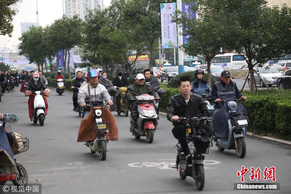 2018年10月9日,山東濟(jì)南,昨日一場秋雨過后開始降溫,今天清晨最低氣溫只有6度,馬路上不少上班族穿上羽絨服騎車趕上班路。 圖片來源:視覺中國