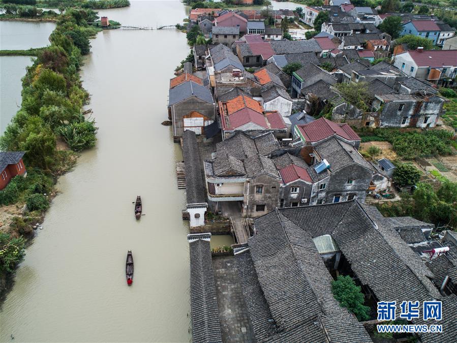 10月10日,泉家潭村村民劃著小船經(jīng)過(guò)沿河長(zhǎng)廊(無(wú)人機(jī)拍攝)。經(jīng)過(guò)改造提升后,沿河長(zhǎng)廊和整潔的古村街巷成為當(dāng)?shù)孛利愢l(xiāng)村的景觀帶。  新華社記者 徐昱 攝