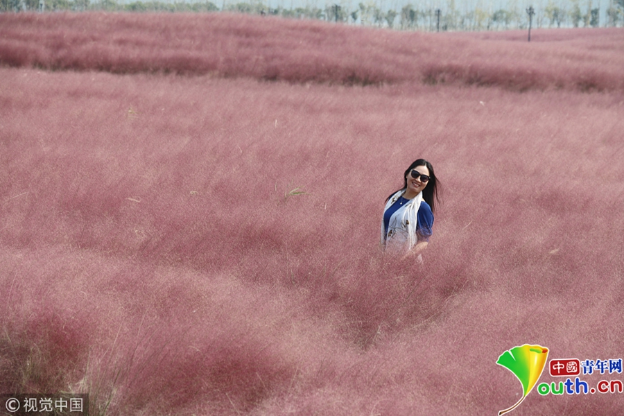 中國青年網(wǎng)北京10月7日電 2018年10月6日,游客在“粉色田野”里游玩、留影。粉黛亂子草是一種觀賞草種,該植物夏季為主要生長季,全株綠色,花期為9月中旬至11月中旬,開花時(shí),綠葉為底,粉紫色花穗如發(fā)絲從基部長出,遠(yuǎn)看如紅色云霧。