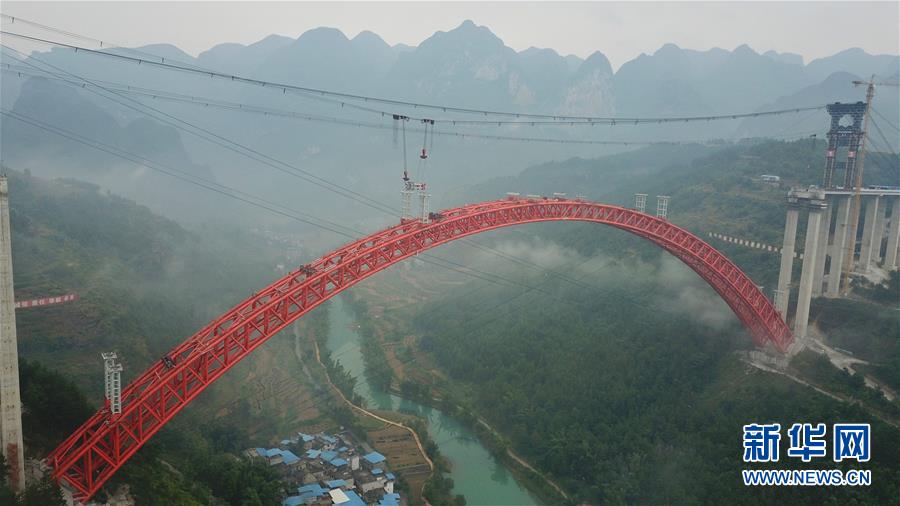 9月12日使用無人機拍攝的大小井特大橋。 目前,橫跨在貴州省羅甸縣大井河上的大小井特大橋建設進入沖刺階段。大小井特大橋全長1.5公里,主跨450米,是世界最大跨徑上承式鋼管混凝土拱橋。據(jù)了解,該橋是平塘至羅甸高速公路關鍵性工程,對打通貴州“斷頭路”,助推滇黔桂石漠化片區(qū)脫貧攻堅具有重要意義。 新華社記者劉續(xù)攝