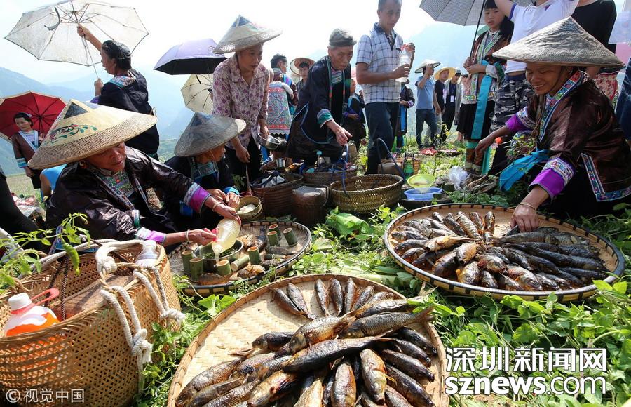 廣西柳州市融水縣山區(qū)有插秧時節(jié)放養(yǎng)鯉魚苗的習俗,金秋時節(jié)稻熟魚肥,收稻燒魚成為別致一景。