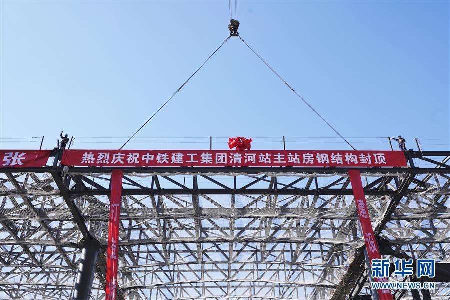 10月17日,工作人員在吊裝鋼梁。當日,京張高鐵新建車站——清河站主體結構正式封頂。清河站是京張高鐵建筑面積最大的車站,同時也是京張高鐵在北京地區(qū)的始發(fā)站之一。 新華社記者 邢廣利 攝
