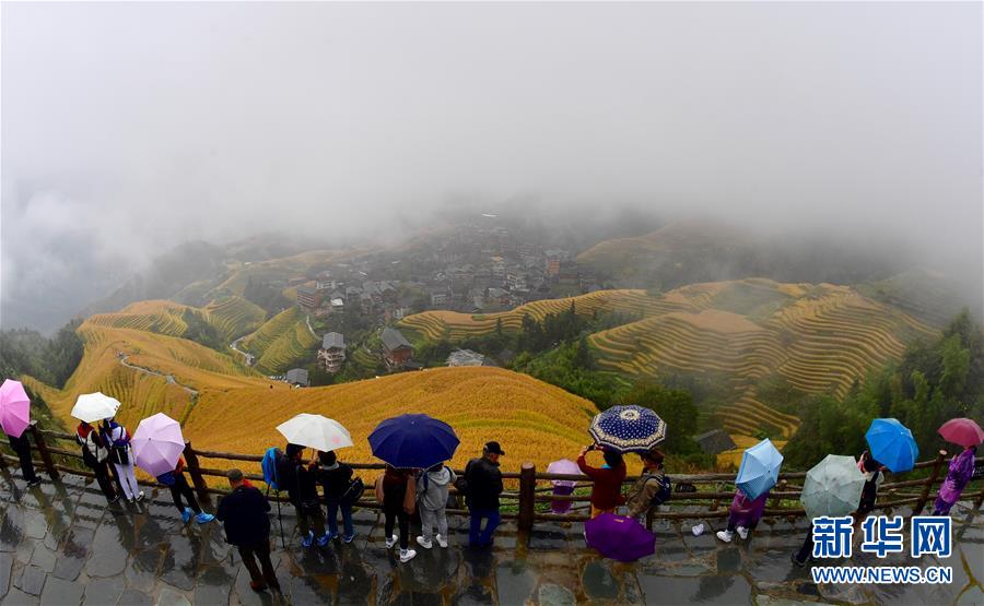 10月16日,游客在秋雨中欣賞龍脊梯田秋色。金秋時(shí)節(jié),廣西龍勝各族自治縣龍脊梯田美如畫(huà)卷。 新華社記者 黃孝邦 攝