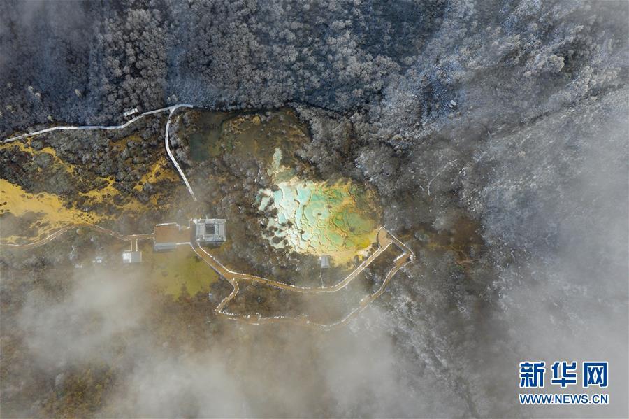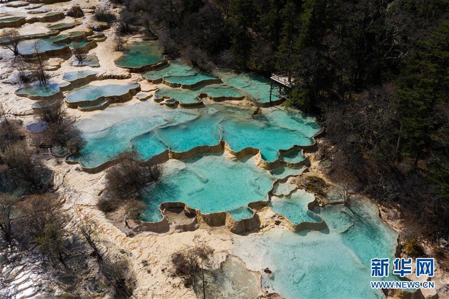 俯瞰黃龍溝五彩池一角,彩池錯落有致,宛如層層玉盤(10月19日無人機拍攝)。 深秋時節(jié),在雪山、藍天、白云和彩林映襯下,黃龍溝中的彩池色彩更加斑斕,目前黃龍景區(qū)進入觀賞最佳時節(jié)。黃龍風景名勝區(qū)位于四川省松潘縣境內(nèi),以彩池、灘流、雪山、峽谷、森林等聞名,享有“人間瑤池”“圣地仙境”之美譽。新華社記者 江宏景攝