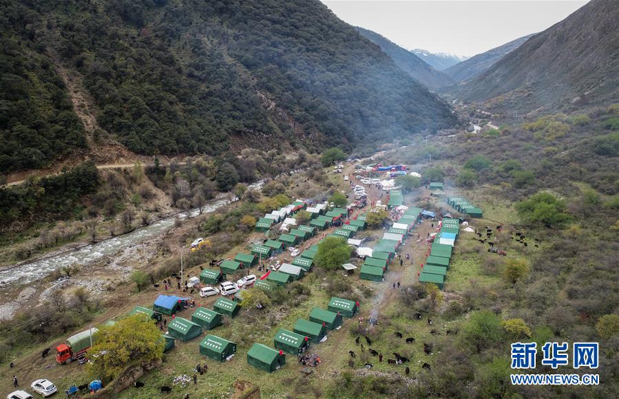 10月19日拍攝的在米林縣派鎮(zhèn)尼定村搭建的安置點(diǎn)。 記者從西藏自治區(qū)林芝加拉村雅魯藏布江堰塞湖災(zāi)情應(yīng)急搶險(xiǎn)工作第二場(chǎng)新聞發(fā)布會(huì)上獲悉,19日13時(shí)30分,雅魯藏布江米林縣堰塞體上游水位超過堰塞體,開始自然過流,上游水位正在緩慢下降。目前,各項(xiàng)搶險(xiǎn)救援工作正在有序開展。 新華社記者 覺果 攝