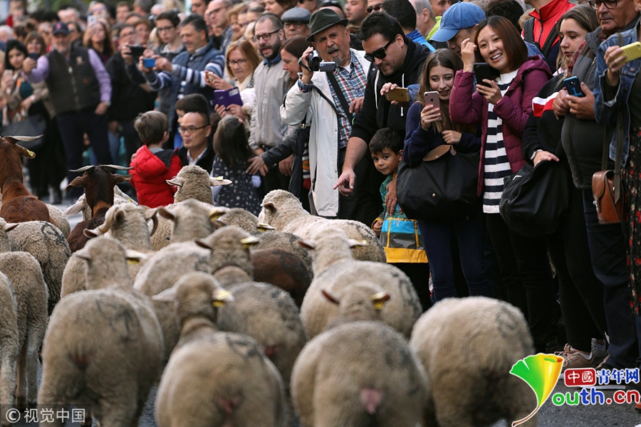 牧羊人驅(qū)趕成百上千只綿羊穿越馬德里市街。