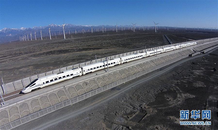 一輛和諧號動車穿行在新疆烏魯木齊達坂城風力發(fā)電場的“風車森林”里(2014年11月16日無人機拍攝)。今年以來,新疆穩(wěn)步推進新能源參與“疆電外送”、擴大與燃煤自備電廠調峰替代交易等多種電力交易方式,著力破解“綠色電力”上網難題,新能源發(fā)電量同比增加近13個百分點,而棄電量和棄電比實現“雙降”,綠色發(fā)展理念進一步落實。 新疆是我國重要的能源供應和儲備基地,風能、太陽能儲量豐富。近年來,新疆新能源裝機總量突破2700萬千瓦,規(guī)模和占比均居全國前列。新華社記者 江文耀 攝