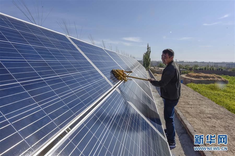 在新疆哈密市伊州區(qū)回城鄉(xiāng)鐵木爾提村,村民潘林琪打掃自家房頂上的太陽能發(fā)電板(2018年9月21日攝)。今年以來,新疆穩(wěn)步推進新能源參與“疆電外送”、擴大與燃煤自備電廠調峰替代交易等多種電力交易方式,著力破解“綠色電力”上網難題,新能源發(fā)電量同比增加近13個百分點,而棄電量和棄電比實現“雙降”,綠色發(fā)展理念進一步落實。新疆是我國重要的能源供應和儲備基地,風能、太陽能儲量豐富。近年來,新疆新能源裝機總量突破2700萬千瓦,規(guī)模和占比均居全國前列。新華社記者 趙戈 攝
