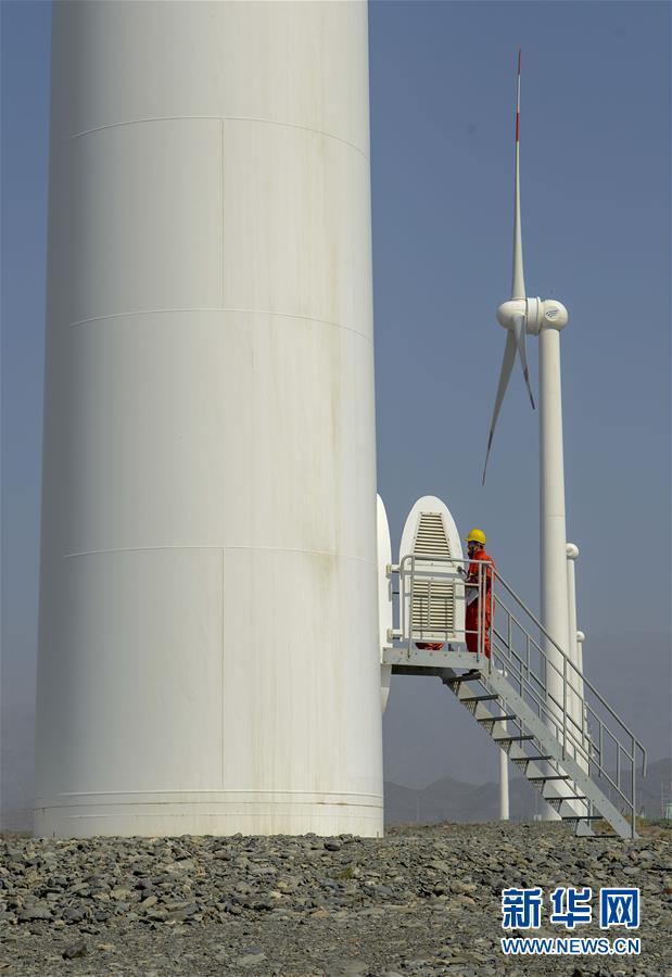 在新疆烏魯木齊達坂城風力發(fā)電場,工作人員查看風力發(fā)電設備(2018年9月18日攝)。今年以來,新疆穩(wěn)步推進新能源參與“疆電外送”、擴大與燃煤自備電廠調峰替代交易等多種電力交易方式,著力破解“綠色電力”上網難題,新能源發(fā)電量同比增加近13個百分點,而棄電量和棄電比實現“雙降”,綠色發(fā)展理念進一步落實。新疆是我國重要的能源供應和儲備基地,風能、太陽能儲量豐富。近年來,新疆新能源裝機總量突破2700萬千瓦,規(guī)模和占比均居全國前列。新華社記者 趙戈 攝