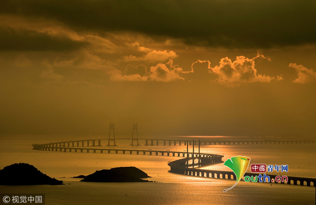 2018年5月21日,廣東珠海,太陽從香港大嶼山慢慢升起,港珠澳大橋猶如一條巨龍蜿蜒盤繞在海面上。