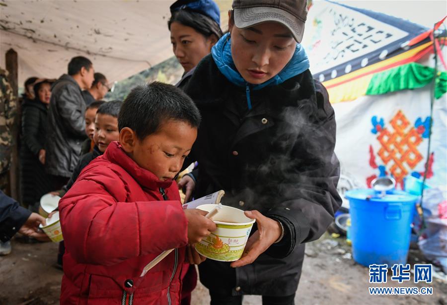 波羅鄉(xiāng)工作人員在臨時過渡安置點內(nèi)為波羅鄉(xiāng)第一小學(xué)學(xué)生盛晚飯(10月14日攝)。 新華社記者 劉東君 攝