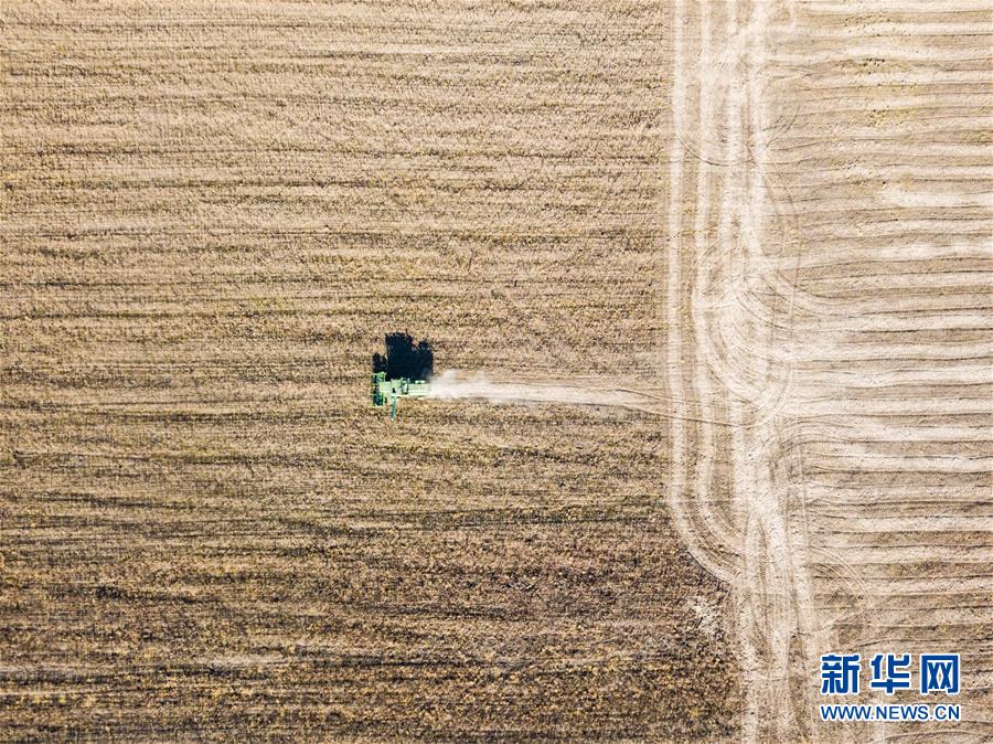 收割機(jī)在俄羅斯猶太自治州比羅比詹市附近的大豆農(nóng)場(chǎng)里作業(yè)(10月19日攝)?!⌒氯A社記者張若玄攝