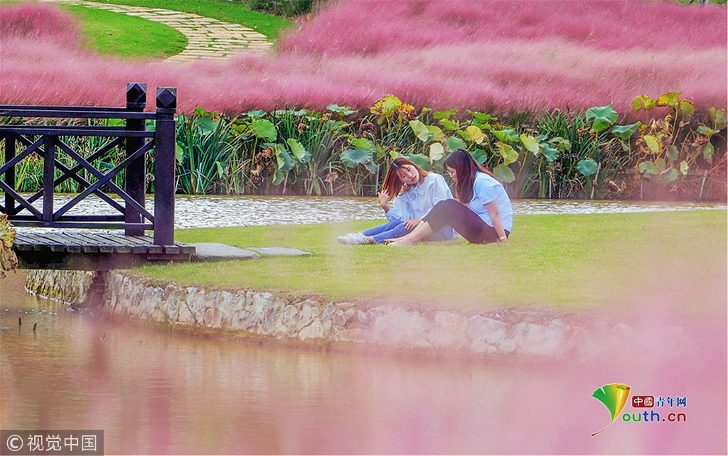 中國青年網(wǎng)北京10月7日電 2018年10月6日,游客在“粉色田野”里游玩、留影。粉黛亂子草是一種觀賞草種,該植物夏季為主要生長季,全株綠色,花期為9月中旬至11月中旬,開花時(shí),綠葉為底,粉紫色花穗如發(fā)絲從基部長出,遠(yuǎn)看如紅色云霧。