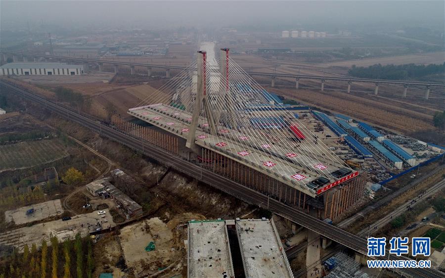 10月25日,唐山市二環(huán)路項目上跨津山鐵路斜拉橋在轉體中(無人機拍攝)。 當日,河北省唐山市二環(huán)路項目上跨津山鐵路斜拉橋轉體成功。據(jù)介紹,該橋總長927.5米,主橋由斜拉轉體橋和轉體T構橋組成,轉體總重5.1萬噸,其中斜拉轉體橋重3.3萬噸,主塔高達80.5米,為曲線變截面“雙人字”形空心塔,自上而下共有128根斜拉索。 新華社記者楊世堯攝