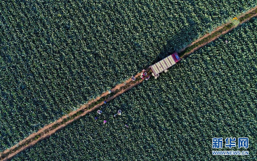 10月29日,樂亭縣馬頭營鎮(zhèn)馬頭營村的農(nóng)民在收獲菜花(無人機拍攝)。 新華社記者楊世堯攝