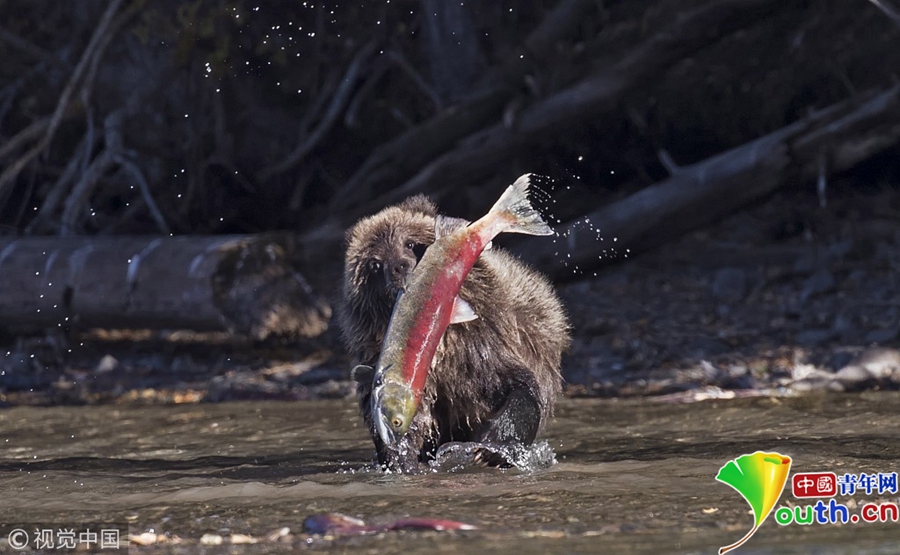 2018年10月29日訊(具體拍攝時間不詳),加拿大英屬哥倫比亞,一只15個月大的棕熊幼崽在Chilko Lake湖畔成功捉到一只4公斤重的紅色鮭魚。