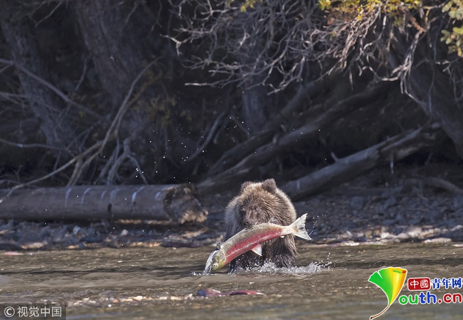 北極熊媽媽帶幼崽覓食 熊寶寶抱“大骨棒”擺拍