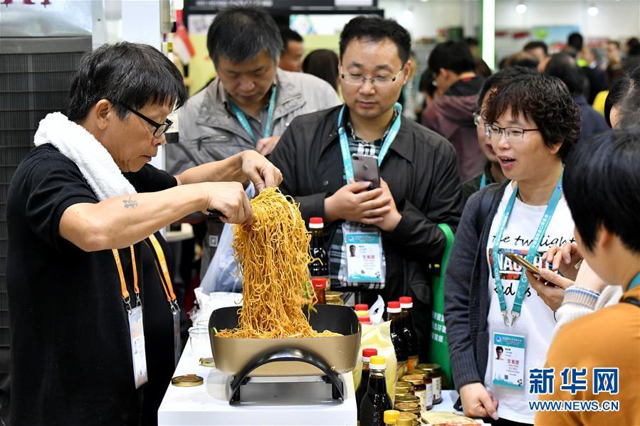 11月7日,來(lái)自新加坡廣祥泰私人有限公司的工作人員用公司生產(chǎn)的調(diào)料為觀眾現(xiàn)場(chǎng)烹制炒面。 新華社記者 李鑫 攝